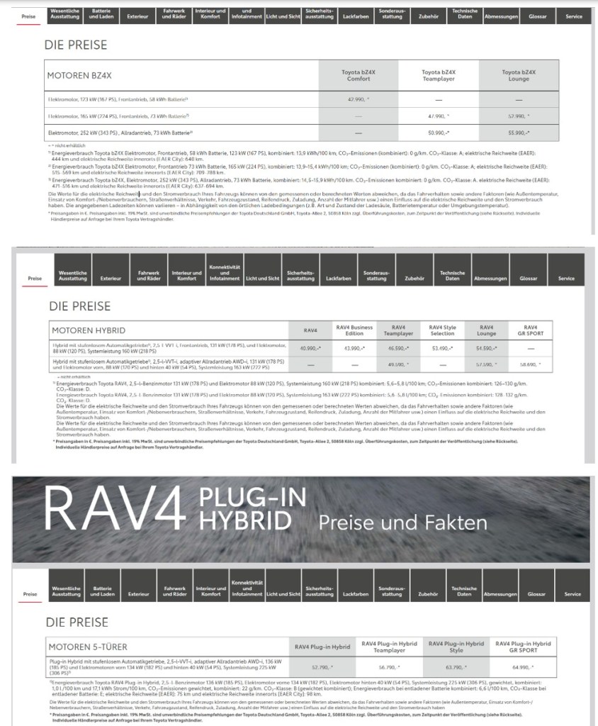 Die Mobilitäts- oder Antriebswende ist angeblich in vollem Gange. Aktuell sieht es bei uns so aus, dass elektrisch fährt, wer es dienstlich tun muss oder soll – oder, wer z.B. zuhause noch kostengünstig per eigener Photovoltaik-Stromerzeugung nachladen kann. Technisch funktioniert das alles gut, dennoch kauft sich kaum jemand freiwillig einen Stromer oder schwankt bei der Kauf-Entscheidung zwischen Verbrenner und Eelktroantrieb. Wenn, dann wird oft geleast – man weiss ja nicht, was mit den Restwerten passiert. Gebrauchte Akku-Autos sind wirklich recht billig zu haben, im Falle eines Defektes (auch ausserhalb des Antriebssystems, z.B. bei einem Ausfall der Klimaanlage) wird dennoch gefühlt recht unverschämt von den Herstellern über die Teilepreise abkassiert. Meine Meinung dazu: vergleichbare Elektroautos müssen wesentlich,mindestens 20-30% billiger als ein Verbrenner-Pendant sein, dann geht das richtig los mit dem Interesse der Verbraucher. Das hab ich auch vor ein paar Jahren hier schonmal geschrieben, auch in einer Diskussion mit dem damaligen Toyota Deutschland-Vertriebsleiter ich das gesagt – der hat mich quasi ausgelacht, ein Elektroauto wäre sicher für 20, 30% mehr im Markt zu verkaufen. Jetzt, gerade eben, habe ich den Preis des 2026er bZ4X und des (noch aktuellen) RAV4 Hybrid Allrad verglichen: das Elektroauto ist heute schon günstiger! Die Differenz wird noch wesentlich größer, wenn man das mit dem RAV4 PlugIn vergleicht. Eigentlich gibt es genug Gründe, die gegen einen Verbrenner sprechen … uups, hab ich das jetzt wirklich geschrieben?